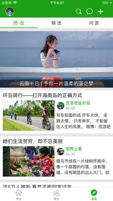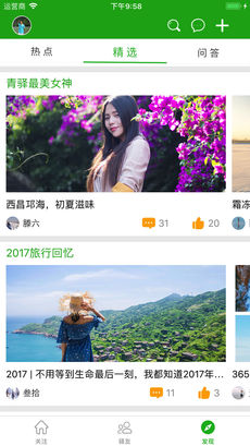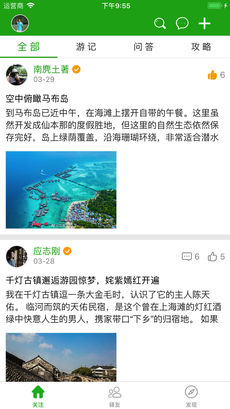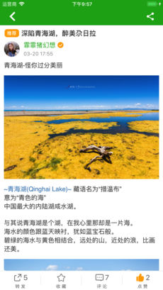 3、在青驿首页看到的内容来自于你关注的用户和旅行地,千人千面,绝对没有重复和强制推送。当你发文时,内容会推送至你的粉丝,也会推送至旅行地页面,精准传天下;