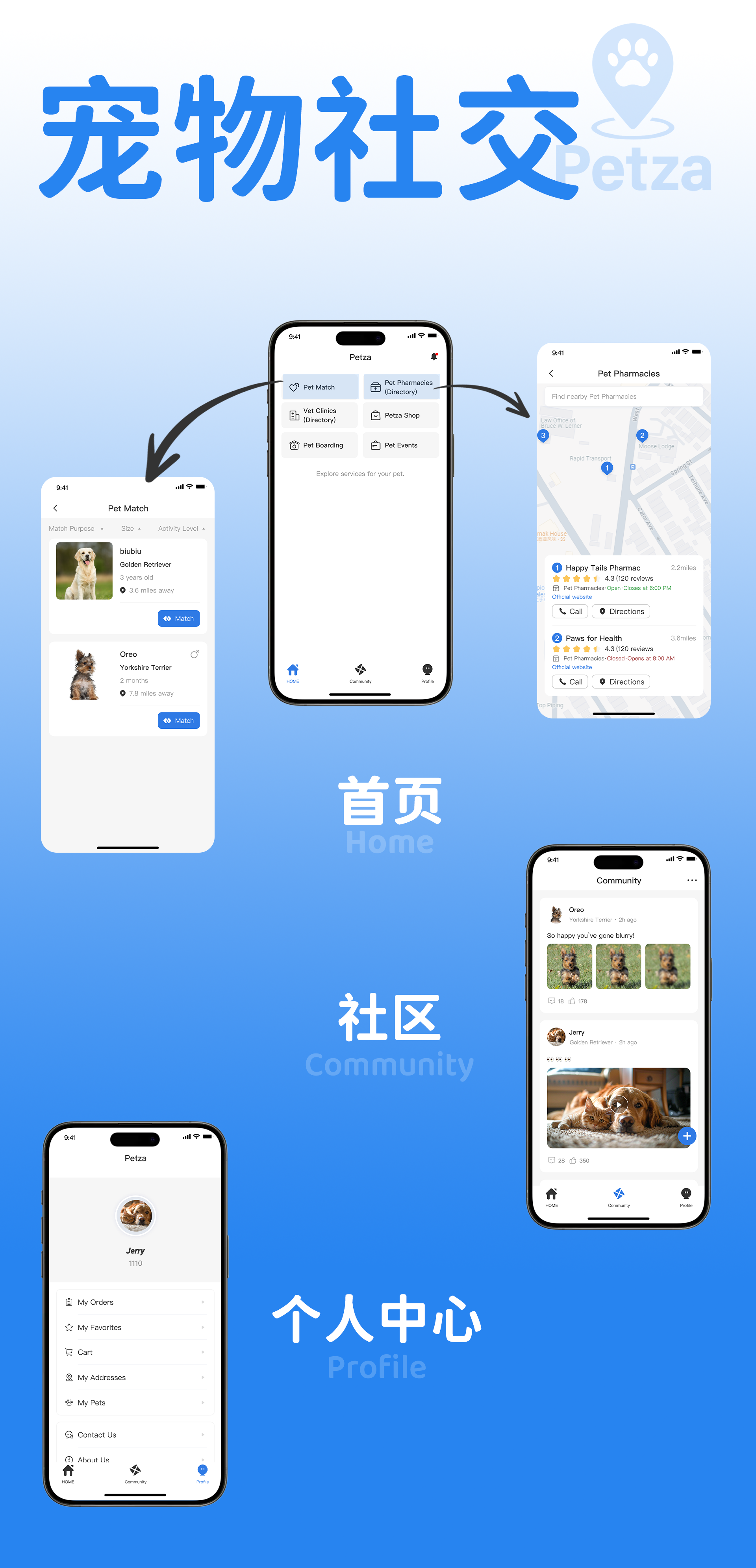 主要功能:宠物项圈对接,宠物伴侣配对,周边宠物服务商家展示,动态发布