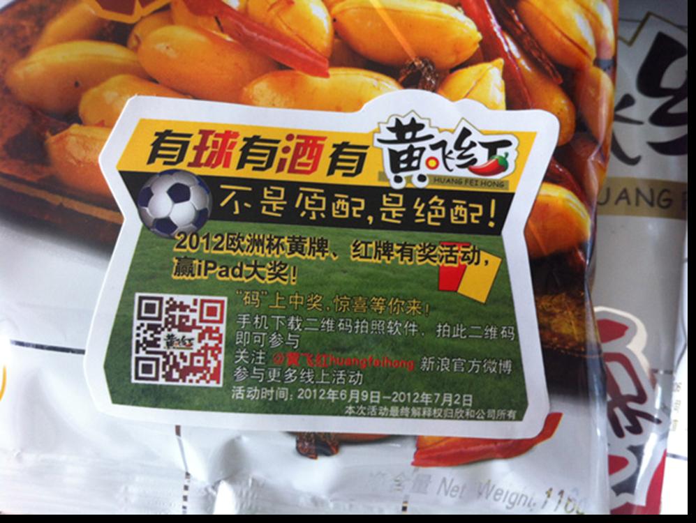 在商品外包装上印上欧洲杯主题的二维码,通过扫描二维码抽奖,奖品为黄飞红提供的麻辣花生,并提出了“有酒有球有黄飞红”的主题口号,使消费者印象深刻,对品牌好感度增强。提供后台数据统计,可随时了解人们何时进行了抽奖,对活动的参与情况能进行有效分析。
